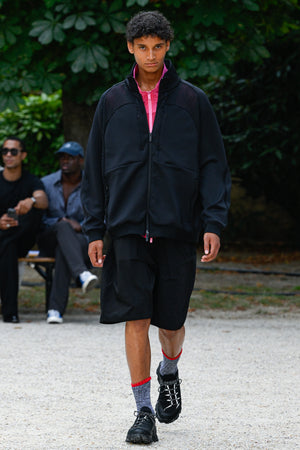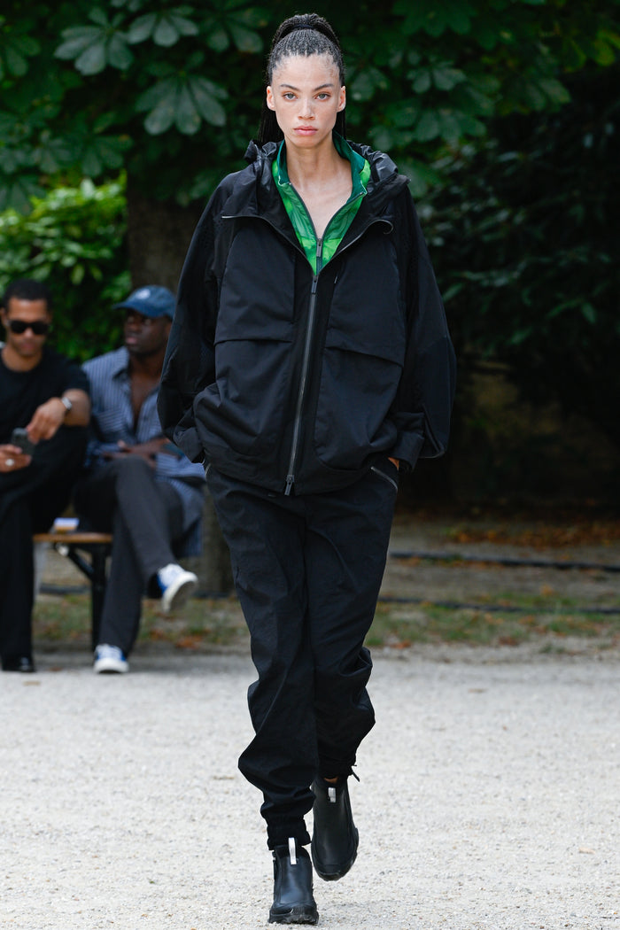 テクニカルウェアライン「BLK」では長年“黒”を基調にしてきたが、今季はその黒という影の世界に対し、光の反射やカラー、素材を組み合わせることで新たな陰影や立体感を作り出そうとしている。また、機能性重視の直線的なデザインではなく、あえて「曲線」や「波動」を取り入れ、視覚的にも時間や空間の変化を感じさせる設計にしている。